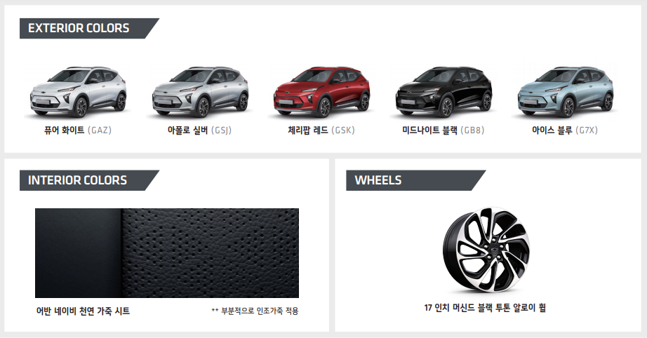 ● 성능 : 150kW 고성능 싱글 모터, 66kWh 리튬이온 배터리, 버튼식 기어시프트, 속도 감응형 전자식 파워 스티어링(EPS), 스포츠 모드, 원페달 드라이빙 모드, 리젠 온 디맨드 패들시프트, 액티브 에어로 셔터 ● 안전 사양 : 10 에어백(앞좌석 어드밴스드, 앞좌석 무릎, 앞/뒷좌석 사이드, 좌우 커튼, 전복감지센서 포함), 셀프실링 타이어, 디지털 서라운드 비전 카메라, 차선 변경 및 사각지대 경고, 후측방 경고, 차선 이탈 방지 경고 및 보조, 전방 충돌 경고(헤드업 LED 경고등 포함), 전방 거리 감지, 저속 자동 긴급 제동, 전방 보행자 감지 및 제동, IntelliBeam® 하이빔 어시스트, 뒷좌석 승객 리마인더, 타이어 공기압 모니터링(적정공기압 알림 포함), StabiliTrak® 차체 자세 제어, 후방 주차 거리 경고, 디스크 브레이크(전륜/후륜), 보행자 보호 가상 사운드 ● 외관 사양 : 블랙 보타이, 17"머신드 투톤 알로이 휠 & 미쉐린 저구름저항 타이어, LED 프로젝션 헤드램프, LED 시퀀셜 방향지시등(전면), LED 주간주행등, LED 보조제동등, LED 리어램프, LED 방향지시등 일체형 아웃사이드 미러(전동접이식/열선내장), 리어 스포일러, 루프랙, 크롬 스트립 도어핸들, 크롬 사이드 바디몰딩, 실버 메탈릭 스키드 플레이트, 리어 와이퍼 & 워셔, 자외선 차단 유리(전체적용), 이중접합 차음유리(윈드실드) ● 내장 사양 : D컷 스티어링 휠 & 블랙 보타이, 어반 네이비 인테리어, 천연 가죽시트, 도어 & IP 가죽 포인트, 8"디지털 클러스터, 앰비언트 라이팅, 크롬 도어핸들, 맵램프, 룸램프, 트렁크 룸램프, 트렁크 폴딩 트레이 ● 편의 사양 : 어댑티브 크루즈 컨트롤(정차 및 재출발/전방 차량 출발 알림 포함), 버튼시동 & 스마트키, 전자식 주차 브레이크, 스마트폰 무선 충전, 풀오토 에어컨, 클러스터 이오나이저, 앞좌석 3단 열선/통풍 시트, 뒷좌석 열선 시트, 운전석 8way 전동시트 & 2way 럼버서포트, 열선 가죽 스티어링 휠, 스티어링 휠 오디오 리모트 컨트롤, 틸트 & 텔레스코픽 스티어링 휠, 오토라이트 컨트롤, 톨게이트 자동결제 시스템, ECM 룸미러, 레인센싱 와이퍼, 앞좌석 세이프티 파워윈도우, 뒷좌석 원터치 다운 파워윈도우, 뒷좌석 6:4 폴딩, 뒷좌석 암레스트, 선바이저 LED 조명 ● 멀티미디어 : EV전용 쉐보레 인포테인먼트 시스템(10.2"고화질 터치스크린), 무선 폰 프로젝션, 듀얼커넥션 블루투스, 6 스피커, 앞/뒷좌석 듀얼 USB 포트(A, C타입) |