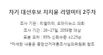 차기 대선후보 지지율 리얼미터 2주차