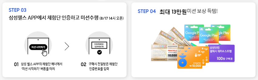 | 삼성헬스 APP에서 체험단 인증하고 미션수행 (8/17 14시 오픈) 01 삼성 헬스 APP의 체험단 배너에서 ‘미션 시작하기’ 버튼을 터치 02 구매시 전달받은 체험단 인증번호를 입력 |
