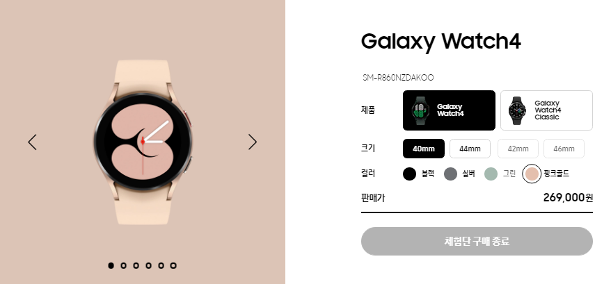 갤럭시 워치4 40mm : 269,000원, 블랙 / 실버 / 그린 / 핑크골드