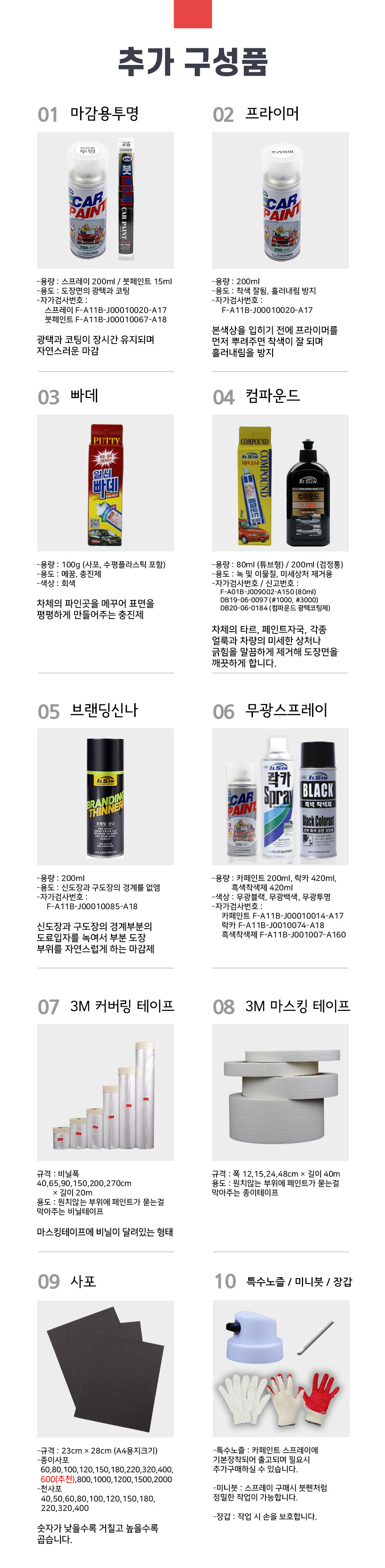 마감용 투명 스프레이, 프라이머, 빠데, 컴파운드, 브랜딩신나, 무광스프레이, 3M 커버링테이프, 3M 마스킹테이프, 사포, 특수노즐, 미니붓, 장갑