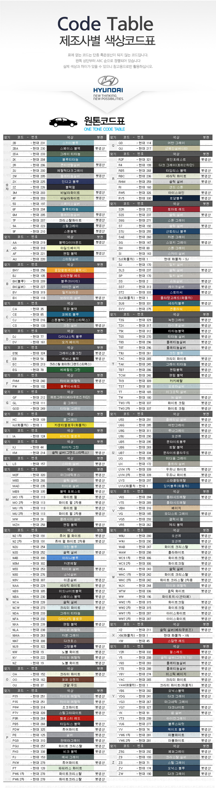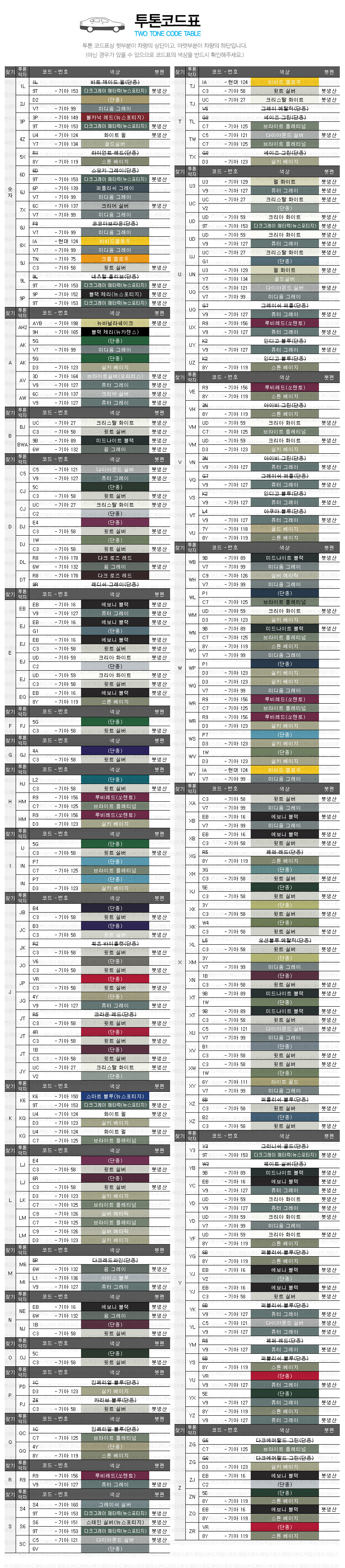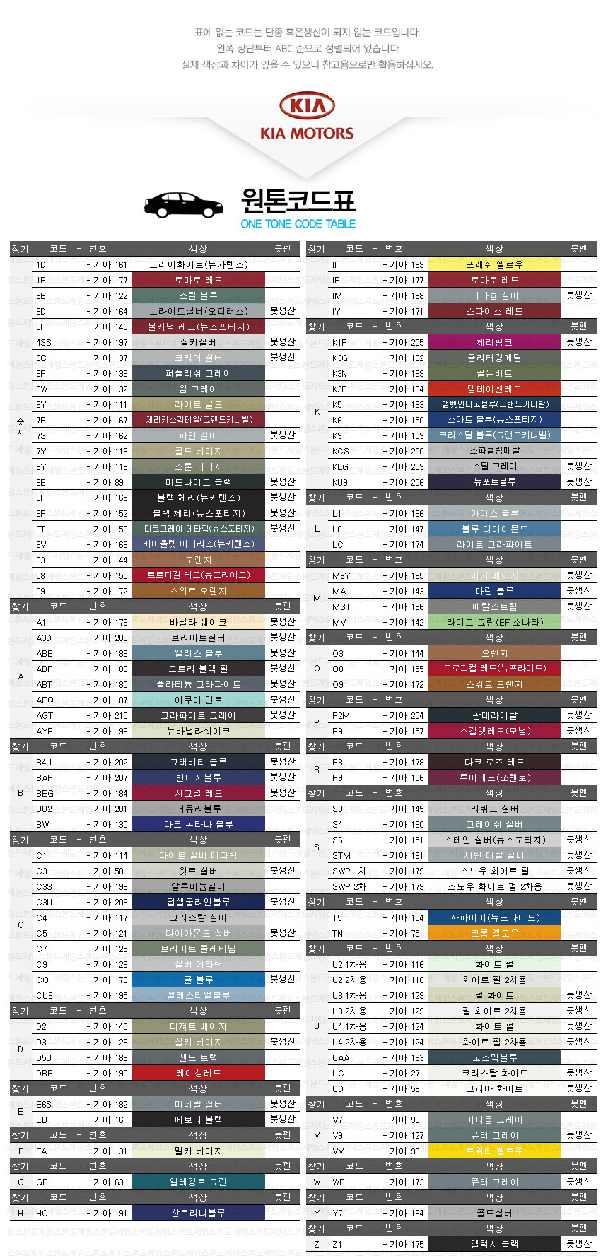 제조사별 색상코드표 현대 / 기아