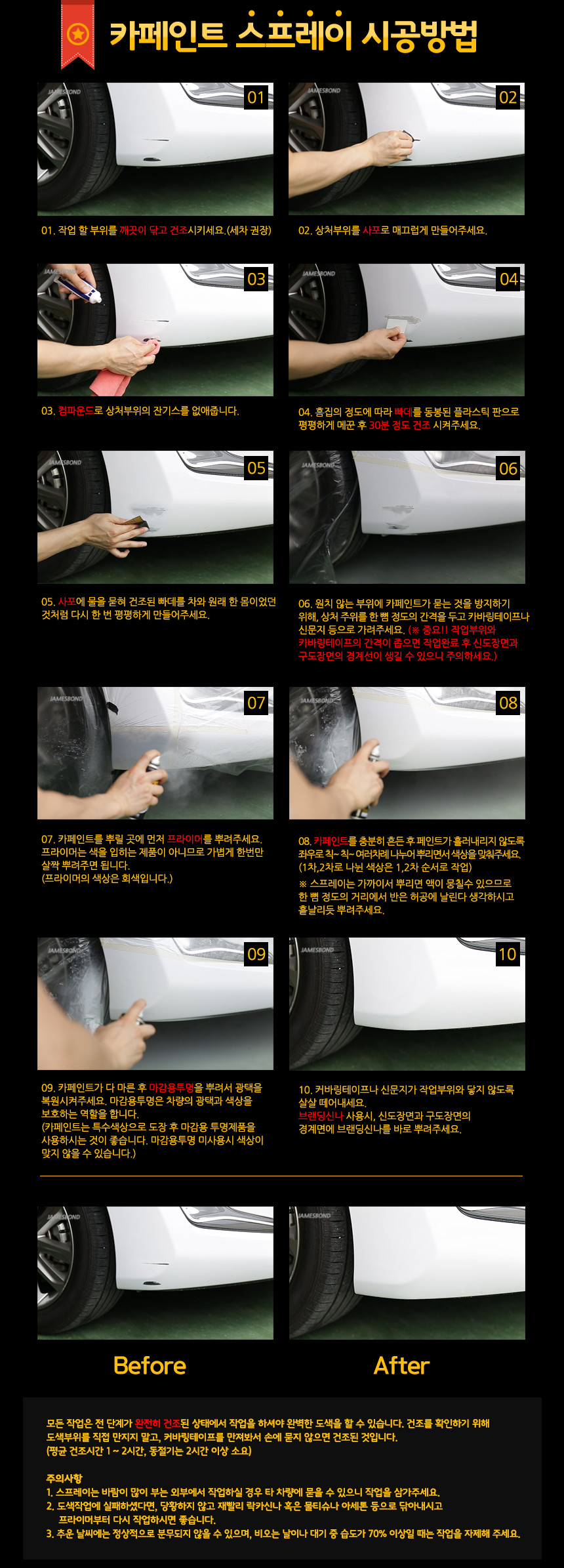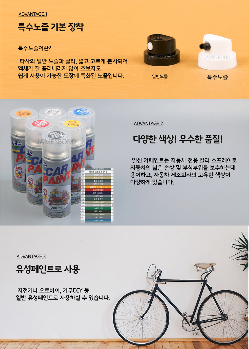 1. 특수노즐 장착 2. 자동차 제조회사의 고유 색상 3. 유성페인트로 사용 가능
