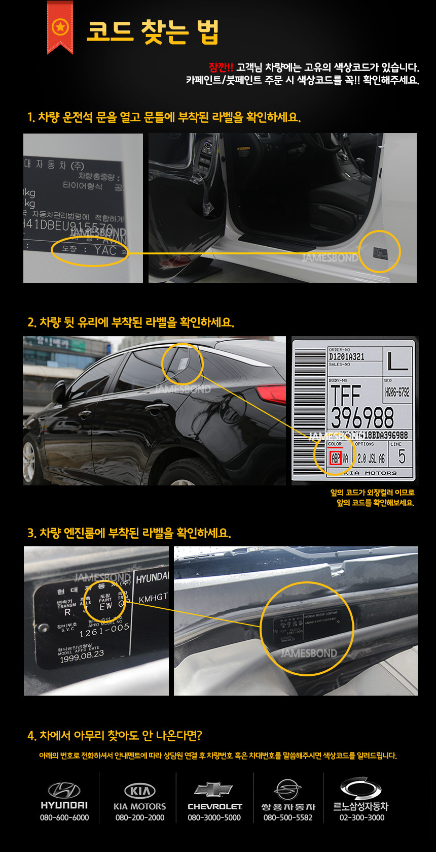 1.운전석 문틀 2.차량 뒷유리 3.엔진룸 4.전화하기 현대 080-600-6000 / 기아 080-200-2000 / 쉐보레 080-3000-5000 / 쌍용 090-500-5582 / 르노 02-300-3000