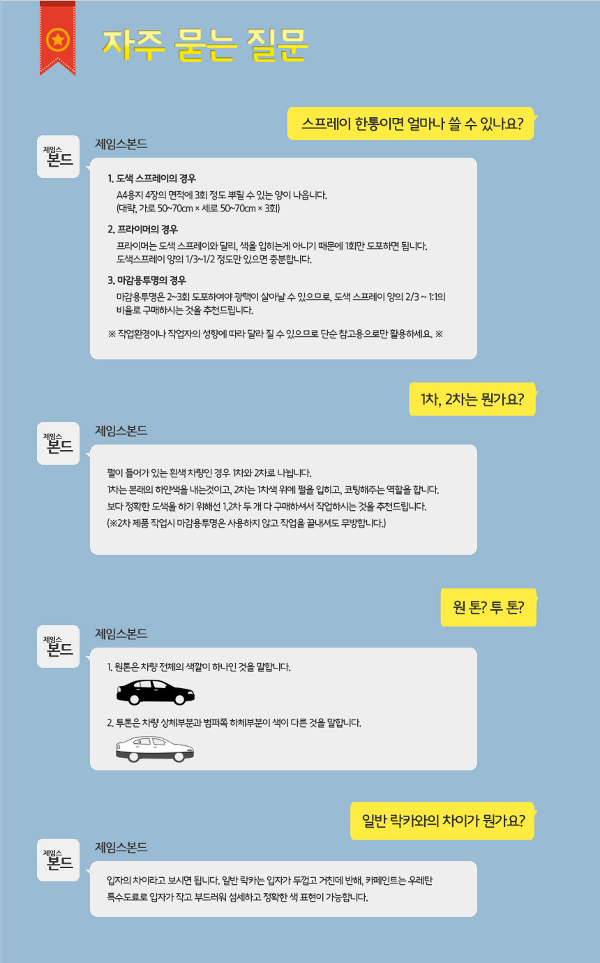 1. 특수노즐 장착 2. 자동차 제조회사의 고유 색상 3. 유성페인트로 사용 가능