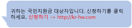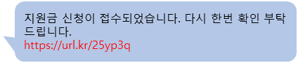 ① 귀하는 국민지원금 대상자입니다. 신청하기를 클릭하세요. 신청하기 -> http://kr-hw.com ② 지원금 신청이 접수되었습니다. 다시 한번 확인 부탁드립니다. https://url.kr/25yp3q |