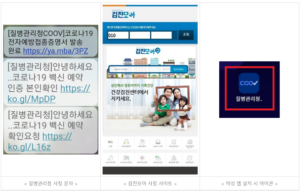 <대응요령>![]() <피해사례> □ 문서나 이미지 등을 가장한 파일, 정부기관이나 거래처 등을 사칭한 문자 또는 이메일을 통해 사용자의 PC나 휴대폰 등에 악성앱, 악성코드 등을 설치하는 사례 증가 <질병관리청 예방접종증명서 관련 스미싱 사례> ![]() |