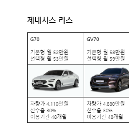 · 제네시스 렌터카 : 이용기간 48개월, 약정 주행거리 연 2.5만km, 선수율 30%, 보험 포함