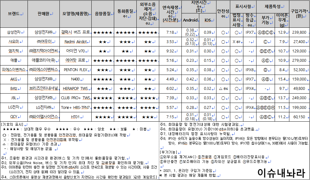| [기호의 표시] ★★★★★ : 상대적 매우 우수 ★★★★ : 우수 ★★★ : 양호 ★★ : 보통 ★ : 미흡 ○ : 전파법, 전기용품 및 생활용품 안전관리법, 최대음량 유럽기준(EU)에 적합 X : 전기용품 및 생활용품 안전관리법에 부적합 △ : 최대음량 유럽(EU) 기준 초과 -:해당사항 및 해당기능 없음 주1. 조용한 환경과 시끄러운 환경(버스 및 기차 안)에서 통화품질을 평가함. 주2. 외부소음(Pink Noise, 버스 및 기차 안)의 최대 차단 및 감쇄량을 확인하여 평가함. 주3. 이어폰을 완전히 충전 후 일정한 크기(85dBA)의 소리로 연속으로 재생할 수 있는 시간이며, 사용 조건 (소리크기, 전지 상태 등)에 따라 달라질 수 있음. 주4. 스마트폰에서 동영상 재생과정에서 음향신호가 지연되는 시간을 확인한 결과임[( )값은 게임모드] |
