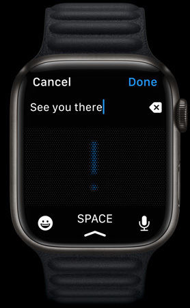 | 시스템 전체에 걸쳐 버튼은 더 큰 디스플레이를 이용하도록 재설계되었다. 그래서 계산기, 스톱워치, 타이머와 같은 앱을 사용하는 것이 그 어느 때보다 쉬워졌다. | Apple Watch first — 새로운 QWERTY 키보드를 통해 QuickPath로 문자 간에 탭 또는 슬라이드를 할 수 있다. 그것은 기계 학습을 사용하여 입력하는 단어를 예측한다. | 화면에 편지를 쓰고 텍스트나 이메일을 작성하려면 낙서를 사용. 디스플레이가 커지면 모든 손가락 타입이 빠르고 쉽게 사용할 수 있다. |