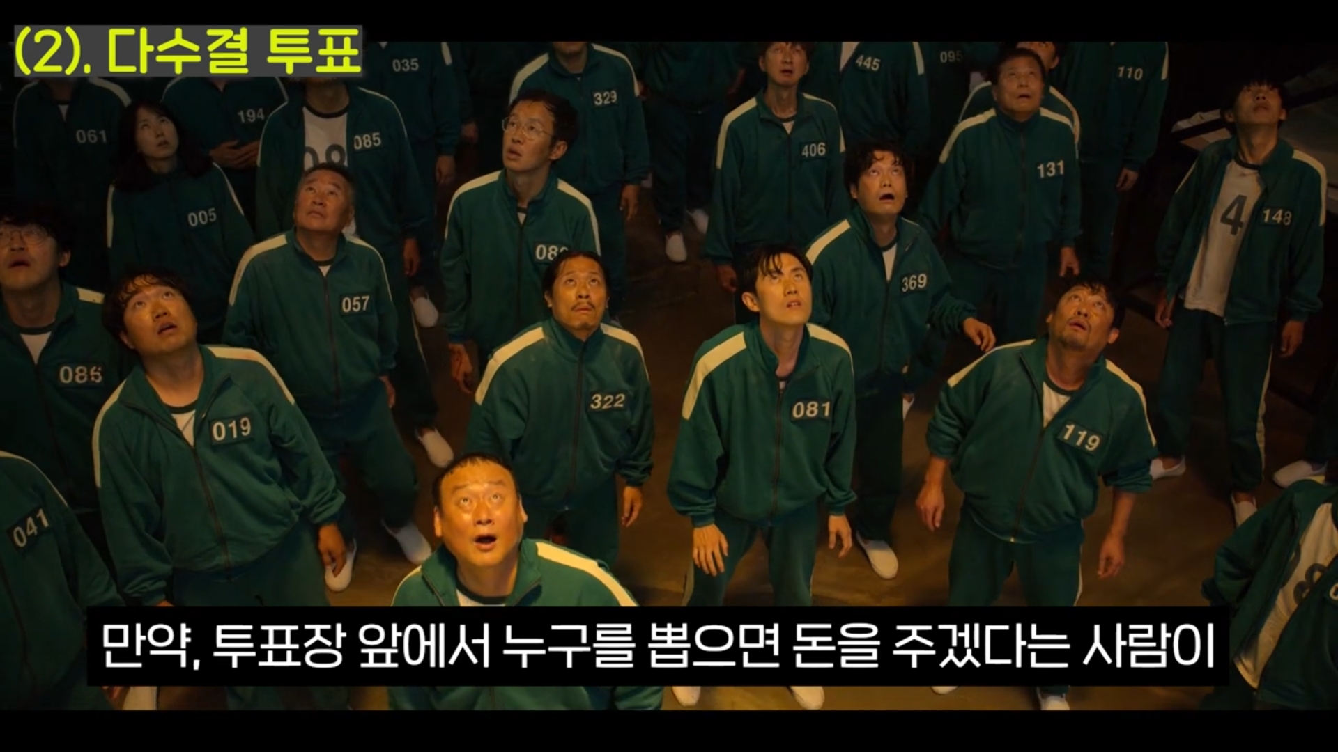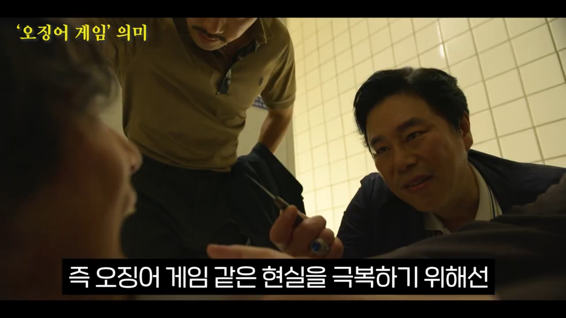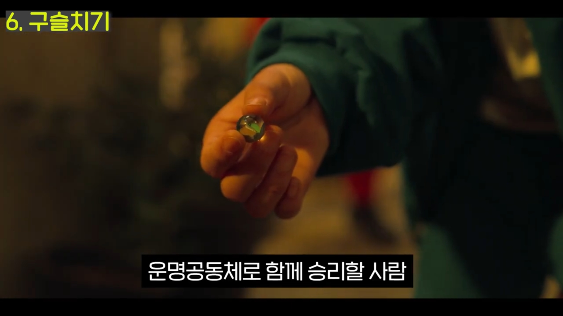 드디어 등장하는 마지막 드러난 여섯 번째 게임 '오징어 게임'은 좌우로 양분된 공격자와 방어자가 등장한다. 오징어 게임의 원리를 알면 같은 팀 모두가 이길 수 있는 방법이 존재한다는 것을 알 수 있다. 그러나 우리는 경쟁사회에서 누군가를 이기기 위해서는 상대를 밟고 일어서야 한다고 배웠다. 오징어 게임은 한 사람만 머리에 도달하면 모두가 이기는 게임이다.