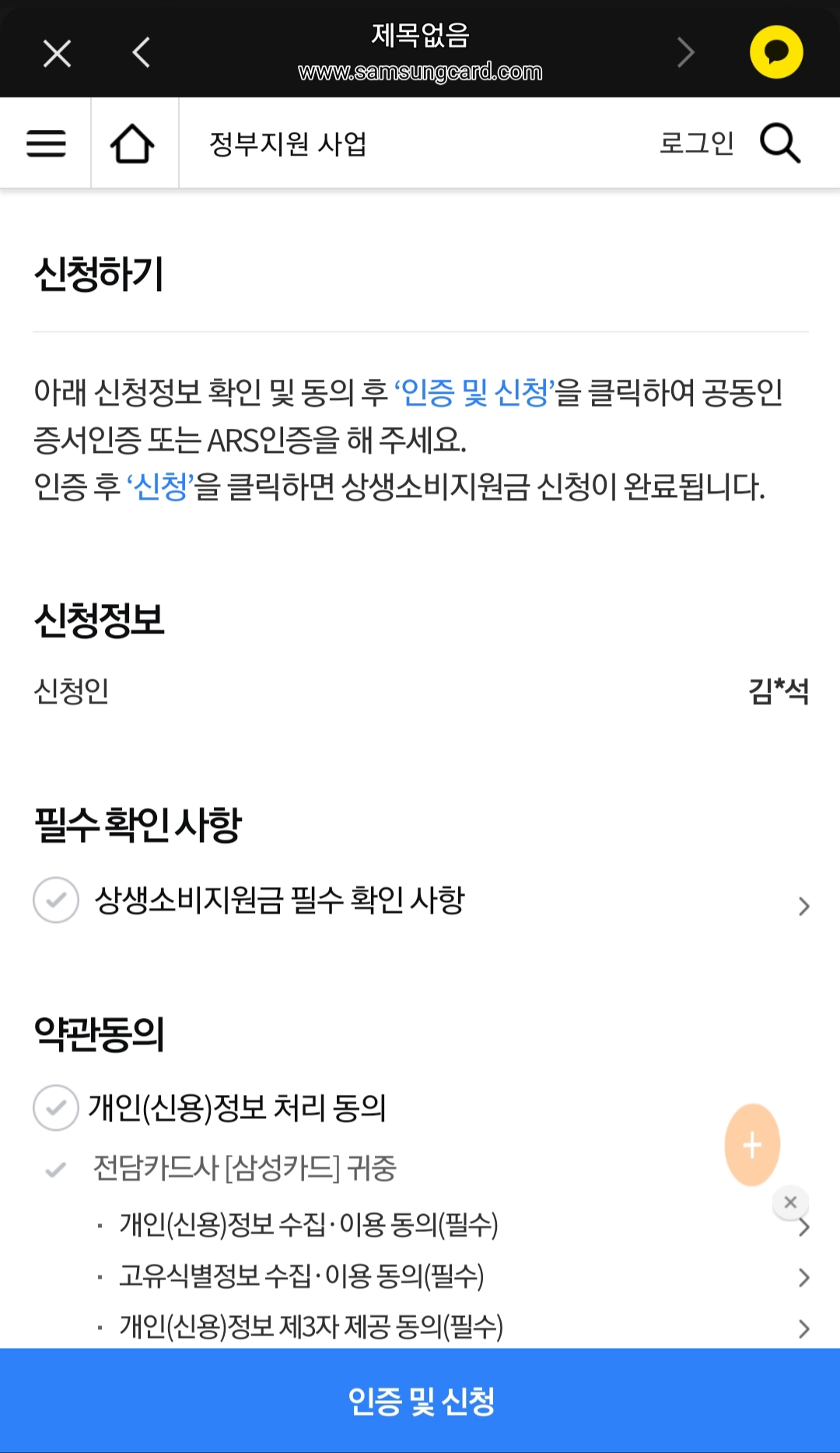 설치가 번거로운 앱이 아니라고 삼성카드 홈페이지로 들어가면 메인에 상생소비지원금 안내가 팝업이나 화면에 나옵니다.