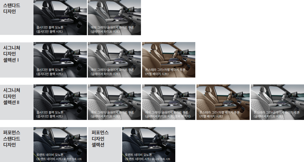 | 시그니쳐 디자인 셀렉션Ⅰ - 천연 가죽 시트(파이핑 적용), 인조 가죽 내장재(크래쉬 패드, 도어 센터트림, 도어트림 상단 등), 디지털도트 패턴 알루미늄 내장재 |