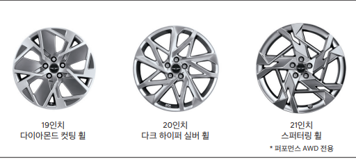 | 스탠다드 AWD | ▶ 235/55R19 미쉐린 타이어 & 휠 | [기본사양] |