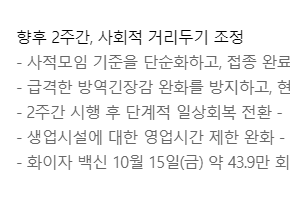 이번 사회적 거리두기 조정안은 10월 마지막 2주 동안 적용되고, 이 기간은 단계적 일상회복으로 이어지는 징검다리격 기간으로써 체계 전환의 준비 및 시범적 운영기간으로 활용된다.