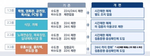 | 1그룹 | 학원, 영화관, 공연장, 독서실, PC방 등 | 수도권 22/24시 | 시간제한 해제 |