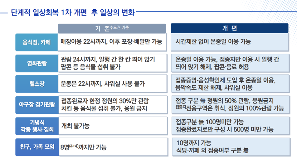 사회적 거리두기 단계적 일상회복 1차 개편 후 일상 변화