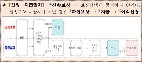 ◈【신청·지급절차】 ①신속보상 → 보상금액에 동의하지 않거나, 신속보상 대상자가 아닌 경우 ②확인보상 → ③지급 → ④이의신청