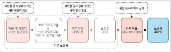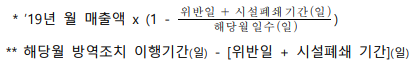 - ‘19년 월 매출액* 및 방역조치 이행일수**에서 방역조치 위반일 및 그에 따른 시설폐쇄 기간만큼 제외하고 보상금 산정(상·하한 적용)