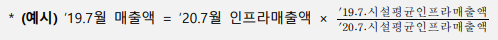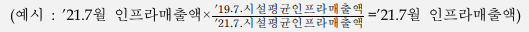 - 최근에 개업하여 ‘19년 인프라매출액이 없는 경우, 계절적 요인을 반영하기 위해 ’20년 또는 ‘21년 동월 인프라매출액으로 ’19년 인프라매출액 추정