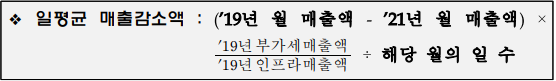 ◦ (일평균 매출감소액) 월별 과세인프라매출액(이하 인프라매출액)* 감소분(’19년 대비 ’21년)을 해당 월의 일(日)수로 나눈 값