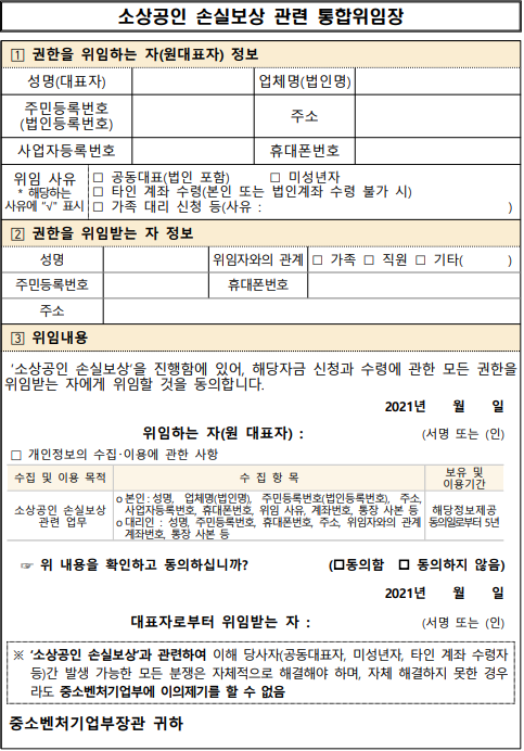 □ 대표자 본인이 손실보상시스템에서 본인인증을 할 수 없거나, 직접 신청 불가한 경우, 대리인을 통해 신청 가능(단, 통합위임장 제출 필수)