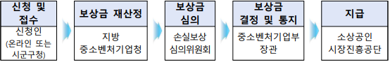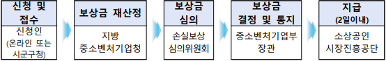 | <온라인 시스템을 통한 이의신청 및 보상금 산정‧지급 절차> ① 확인보상 신청결과 확인 → ② 유의사항 확인 및 정보 활용 동의 → ③ 사업자 등록번호 입력 및 본인인증 → ④ 이의신청 증빙자료 제출 → ⑤ 이의신청 심의 및 보상금 재산정 → ⑥ 지급 |