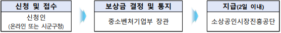 ① 홈페이지의 ‘보상금 신청’ 클릭 → ② 유의사항 확인 및 정보 활용 동의 → ③ 사업자등록번호 입력 및 본인인증 → ④ 사업장 기본정보 확인 → ⑤ 보상액 확인 및 지급신청 → ⑥ 지급