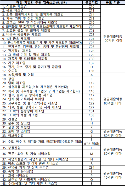붙임1 업종별 소기업 요건