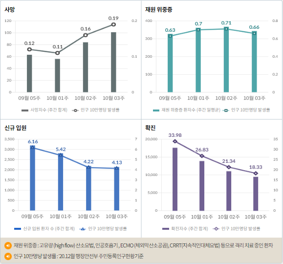 중환자 전담치료병상은 총 1,065병상을 확보(10.28.기준)하고 있으며, 가동률은 전국 43.2%로 605병상의 이용이 가능하다. 수도권 287병상이 남아 있다.