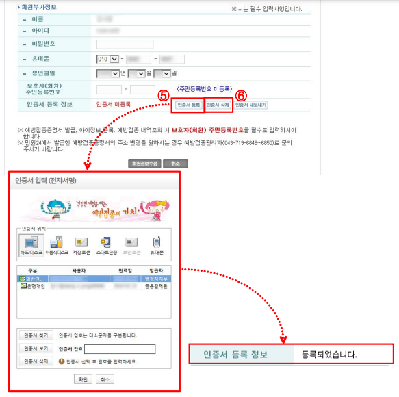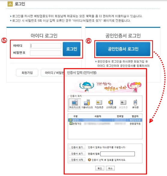 ➏ [공인인증서 로그인] 버튼 클릭 후 인증서 선택 / 인증서 암호 입력 후 확인