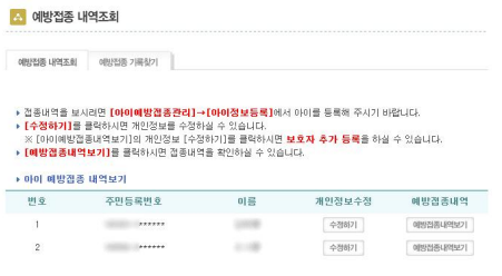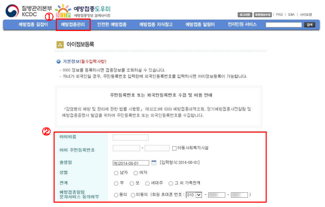 예방접종관리 → 자녀 예방접종 관리 → 아이정보등록
