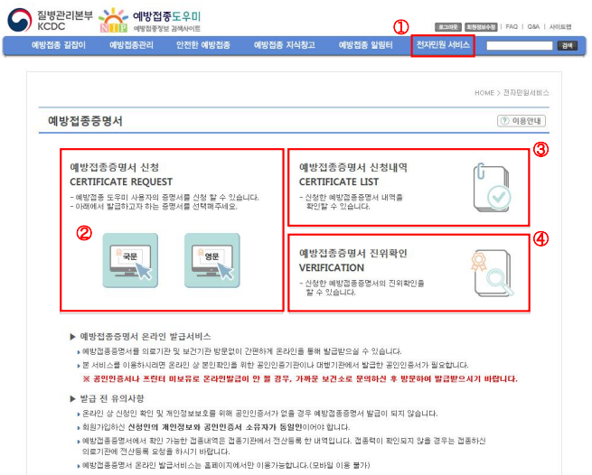 예방접종 증명서 신청 방법 안내 (CERTIFICATE REQUEST. 질병관리청)