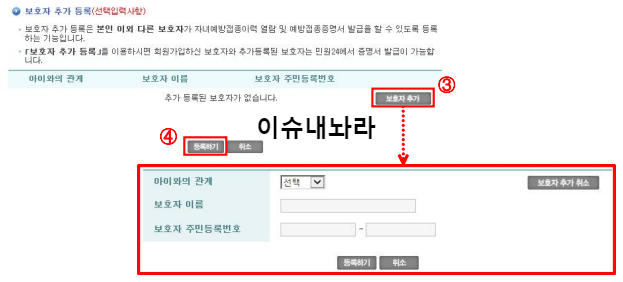 추가 등록할 보호자 정보를 입력 후 [등록하기] 버튼 클릭