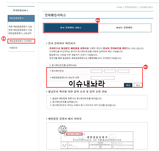 전자민원서비스 → 예방접종증명서 진위확인 → 문서 진위확인 서비스