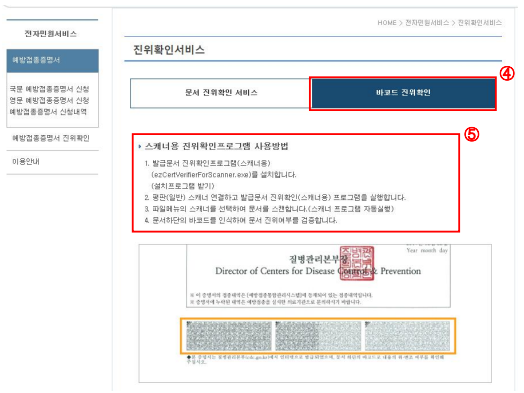 ‘예방접종증명서 진위확인’ 메뉴 클릭