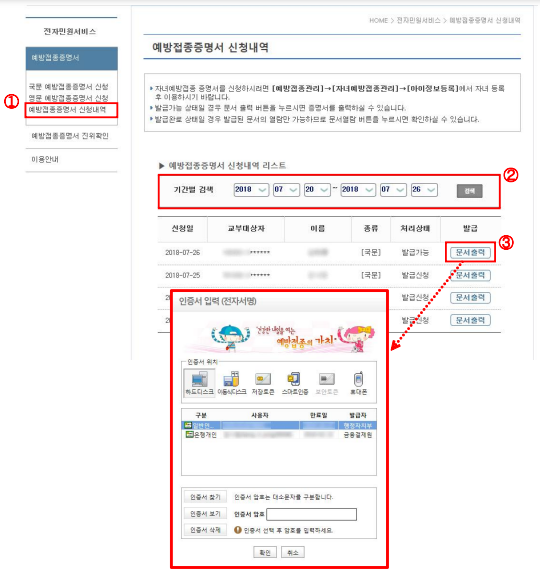 예방접종증명서 문서출력 / 문서열람