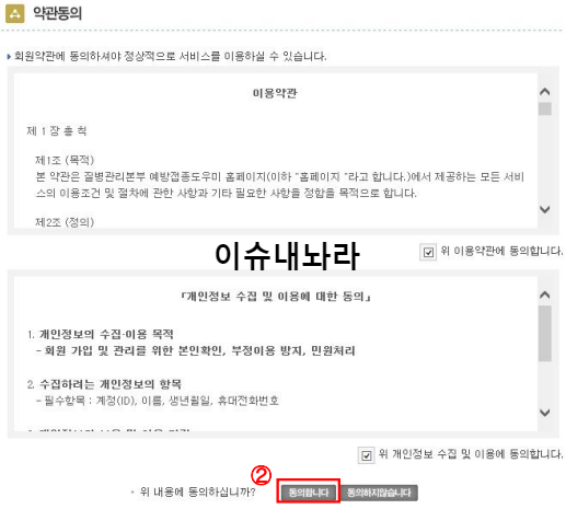 ➋ 약관동의 화면에서 ‘이용약관’ 및 ‘개인정보 수집 및 이용에 대한 동의’ 체크 후 [동의합니다] 버튼 클릭