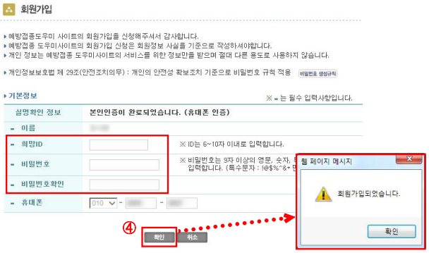 ❹ 회원 기본정보(희망 ID / 비밀번호) 입력 후 [확인] 버튼 클릭
