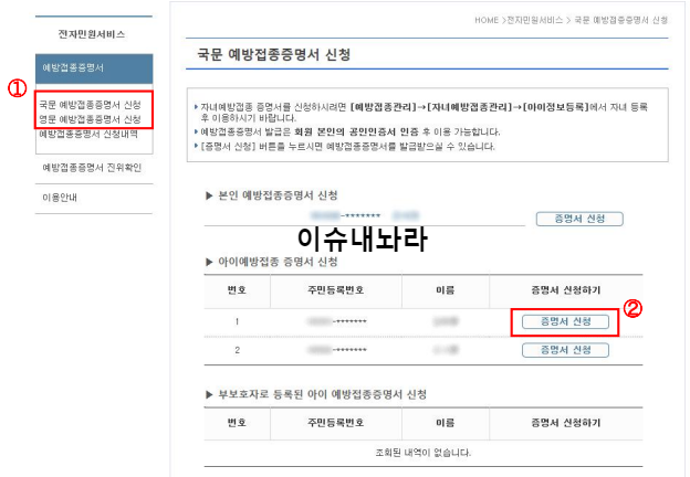 전자민원 서비스 → 예방접종증명서 → 국문(또는 영문) 예방접종증명서 신청