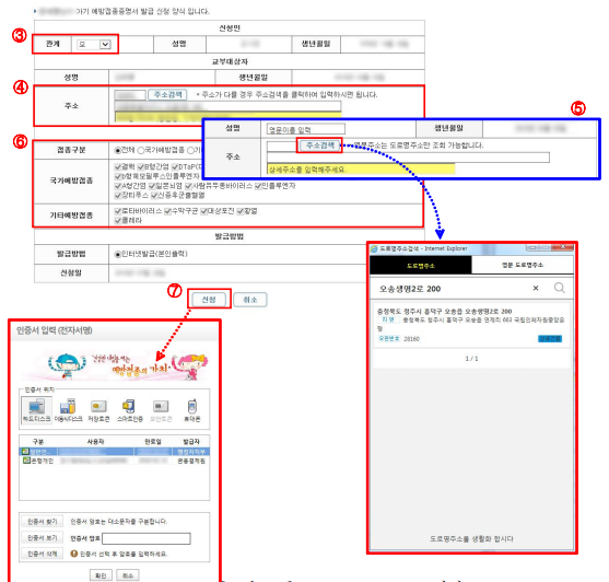 ❼ [신청] 버튼 클릭 → 인증서 선택 / 인증서 암호 입력 후 확인