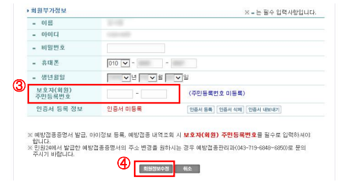 ❸ 개인정보 수집 및 이용에 ‘동의합니다’ 체크 후 보호자(회원) 주민등록번호 입력