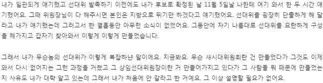 내가 선대위를 이렇게 구성할 적에 이런 선대위 구성하면 안 된다고 난 처음부터 그랬어요. 그러다가 안 가려고 했던 건데 하도 주변에서 정권교체 관련해서 왜 책임회피 하려고 하니 그래서 내가 12월 3일에 조인했는데 가서 보니 선대위가 제대로 작동을 안 해요.