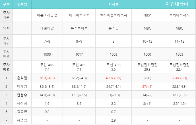 | 3 | 안철수 | 14.0(+6.0) | 12.1(+5.5) | 13(+7.3) | 14(+2) | 12.1(-1.5) |