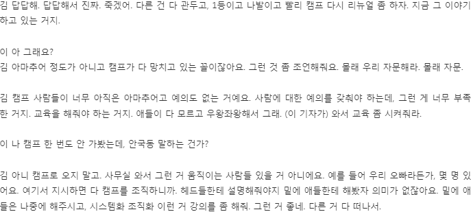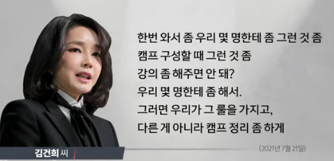 김 우리 캠프가 엉망이에요. 지금 그래서 다시 재정비를 해. 엉망인 거 알잖아. 얘네들이 총장은 혼자만 다니고, 모든 걸 알아서 딱딱해줘야 하거든? 우린 정치 경험이 없는 사람들이잖아. 그러면 머리를 쓸 줄 모른다고. 그걸 경험 있는 사람이 해줘야 하는데 경험이 있는 사람들도 없고. 우리가 아직 당에 입당한 것도 아니잖아요. 국민의힘이 좋은 당도 아니고, 그러니까 이게 너무 아마추어인 거야. 뭐든지 하는 게 경력도 없고, 그러니까 바보같이. 총장이란 이 상품은 좋은데, 너무 안 따라주는 거지.
