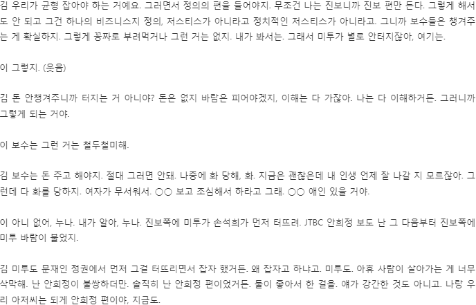 김 당연하지. 왜 그걸 미투를 해야 해? 둘이 서로 좋아해서 했으면서. 김지은이 웃긴 애 아니야? 지가 소리를 질렀어, 뭐했어? 둘이 합의 하에 했으면서. 그 당시에 전부 그렇게 해서 걸려든 게 진보 쪽이 걸려들었잖아. 미투 그런 식으로 하니까. 나는 아닌 것 같아. 여자가 좋으면 손 한번 만질 수 있잖아, 사람이 연애하다 가도. 사랑이란 게 결혼했다고 안 생기고 그런 거 아니잖아. 잘못하면 미투에 걸려. 그러면 생명 매장돼. 사회가 어디 연애나 하겠어? 남자들