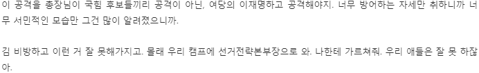 김 몰라 우리 남편은 그런 지시를 한 적도 없고 원래 그런 거 안 해요. 우리 남편은. 고소하겠다고 해도 그걸 또 말리는 사람인데, 우리 그래서 하나도 못했잖아요. 그니까 사람들이 오해를 많이 했고. 하여튼 쟤네가 공작을, 유승민하고 홍준표 쪽에서 지가네가 우리 남편을 떨어뜨려야 자기네가 나오니까, 그렇게 하는 것 같아요. 원래 다 적은 내부에 있다고 그랬잖아요