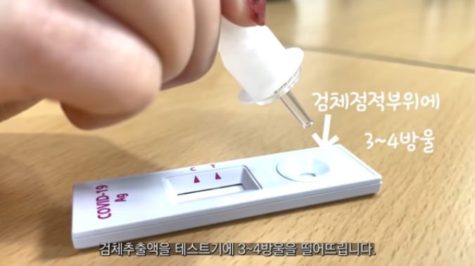 검체추출액을 3~4방울 떨어뜨리고 30~40분을 기다립니다.