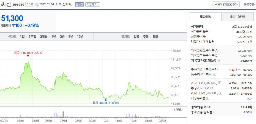 현재 씨젠의 주가는 5만 원대까지 하락했다.