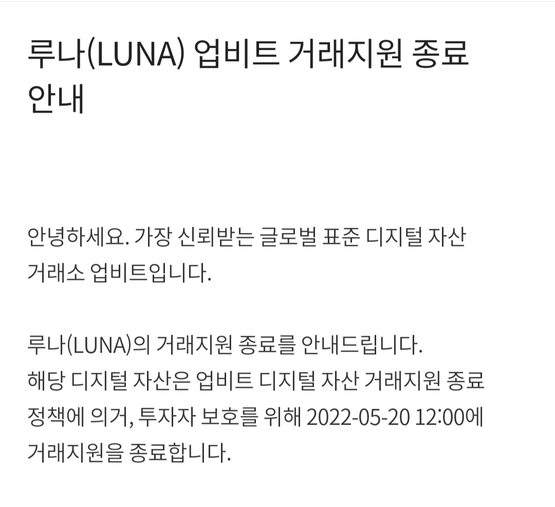 루나(LUNA)의 거래지원 종료를 안내드립니다.
